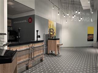 De horecaruimte heeft een open en lichte uitstraling met grote glazen gevels die zorgen voor veel natuurlijk licht en zicht op de stationshal. Door de glazen wanden kijk je uit op het drukke station Den Haag Hollands Spoor, met reizigers die in en uit de stationshal stromen. Binnen staat een grote toonbank met kassa en productdisplay, waar producten overzichtelijk gepresenteerd kunnen worden. Achterin de winkel zijn de ovens en werkstations zichtbaar, zodat klanten de productie kunnen zien. Dit geeft de mogelijkheid tot een open “live baking” concept en versterkt de beleving van versheid en ambacht. Achter de zichtbare werkruimte staan koel- en opslagcellen, afgeschermd door achterdeuren. Er is voldoende loopruimte voor klanten om langs de toonbank te lopen en producten te bekijken.