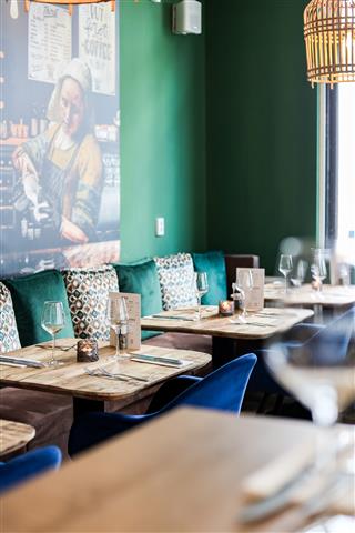 Het Grand Café heeft de entree aan de voorzijde. Direct bij binnenkomst van de knusse, lichte ruimte op. Door de hoekligging heeft het vele raampartijen met een goed zicht naar buiten. Het karakteristieke pand heeft hoge plafonds en authentieke ramen. De in het oog springende bar bevindt zich tegen de achterwand. Vanuit het Grand Café is tevens het terras te bereiken via de openslaande deuren.