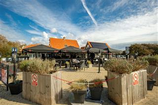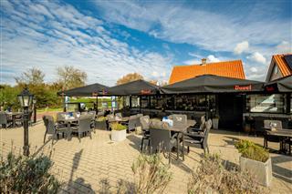 Het eerste wat opvalt, is het ruime, sfeervolle terras op het zuidwesten; vrijwel de hele dag zon dus én een geweldig uitzicht op de duinen! Met plaats voor 120 gasten is dit een regelrechte blikvanger. Het terras is ingericht met antracietkleurige stoelen en banken, houten tafels en oogt modern en comfortabel. De 10 parasols, 4 heaters en een vuurtafel maken het compleet. Vrijwel de helft van terras kan worden afgesloten. Van deze veranda kan het dak open en dicht en de windschermen aan de zijkanten zijn in hoogte verstelbaar. Zo kun je flexibel inspelen op het weer en is er altijd een plek waar gasten beschut én behaaglijk kunnen genieten van zon, zee en sfeer.