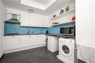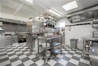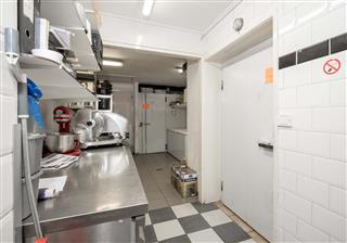 De keuken is opvallend groot en efficiënt opgezet, met toegang via het middengedeelte van de bar en langs beide zijden. Ze is verdeeld in een warme kant, koude kant, spoelruimte en beschikt over 2 koelcellen, waarvan één directe toegang biedt tot een vriescel. De keuken is uitgerust met professionele apparatuur zoals een Rational steamer, 8-pits gasfornuis, bakplaat, twee friteuses, een visfrituur, warmtekast, twee au bain maries, saladière, twee koelwerkbanken, een vrieswerkbank, warmtebrug en een vaatwasser. Hierdoor kan efficiënt en veelzijdig worden gewerkt. De bevoorrading vindt plaats via de achterzijde van het pand, waar tevens het magazijn is. Hier bevindt zich ook een snackbar, die door een derde partij wordt geëxploiteerd.