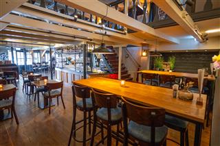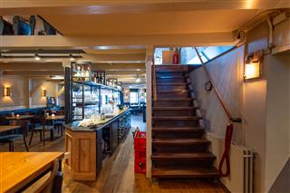 De bar met industrieel zwart stalen flessen/glazenrek en koperen biertapinstallatie bevindt zich op een logische plek centraal in de ruimte tegenover de entree. Hierachter bevinden zich de toegang tot de keuken, spoelkeuken, de trap naar het lagergelegen bijgebouw en de eerste verdieping van het restaurant. De keuken is ca. 52 m² en voorzien van alle professionele apparatuur, grotendeels nieuw aangeschaft in 2022.
