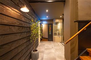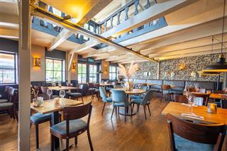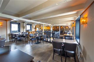 Via het gevelterras bereik je de entree aan de rechterkant van de voorgevel. Door het glazen tochtportaal kom je de begane grond van het restaurant binnen. Dit is een L-vormige ruimte van ca. 110 m² met