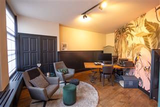 Via een kleine trap kom je in het verbonden bijgebouw, waar zich de gescheiden toiletgroepen bevinden, die in 2022 volledig zijn vernieuwd. Ook is hier een ruim kantoor/woonkamer met een achteringang via de lager gelegen Sint Janstraat, met daarboven een studio van ca. 21,5 m2 groot. De nog lager gelegen, ruime kelder is uitermate geschikt als personeelsruimte en opslag.