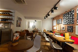De ruimte loopt in een L-vorm, met door de gehele zaak verschillende zitplaatsen. De indeling is overzichtelijk. Aan de rechterzijde staat bij binnenkomst een lange tafel waaraan met vrienden gezellig kan worden bijgekletst onder het genot van een kop koffie.