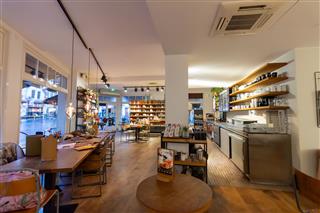 Verder in de zaak staan langs de de gehele rechterzijde tot achterin diverse tafels en stoelen, waardoor de zaak goed gevuld is. Aan de achterwand staat een lange bank met meerdere tafeltjes waaraan eveneens in een sfeervolle setting van de lekkernijen kan worden genoten. Aan de linkerzijde van deze ruimte bevinden zich de toiletgroepen.