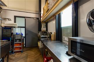 Links van de bar bevindt zich het bestelgedeelte, waar gasten zowel bij de kassa als via een handige bestelzuil hun bestelling kunnen plaatsen. Vanuit deze ruimte leidt een doorgang naar het toilet en de praktische opslagruimte. Deze opslagruimte van circa 20 m² is eveneens uitgerust met professionele horeca inventaris, waaronder een oven, koel- en vrieskasten en RVS-tafels Dit maakt het de ideale plek voor efficiënte bereiding en opslag.