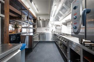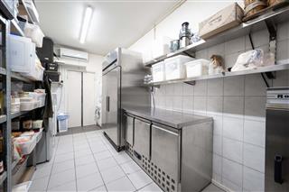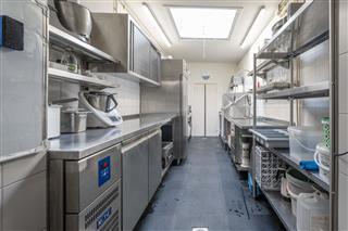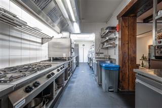 De keuken is ruim opgezet en biedt voldoende werkruimte voor een team van vijf koks. Ze bestaat uit drie ruimtes, waarvan de achterste ruimte afgescheiden is met klapdeuren. De keuken is volledig uitgerust voor een klassieke, complete restaurantkaart. Zo vind je er onder andere vier koelwerkbanken, een 4-pits gasfornuis, Rational combisteamer, salamander, bakplaat/plancha, dubbele koeling, enkeldeurs vrieskast, warmtebrug met lampen, bordenwarmer, glazenwasmachine met osmose en een professionele vaatwasser met waterontharder. Achterin is een aparte ruimte voor voorraad, met tevens een aansluiting voor een wasmachine.