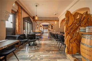 Wie voor het restaurant staat, ziet dat het drie percelen omvat. Het middelste deel is het oudste deel en dateert van circa 1885. Het linkerdeel is, na een brand in 1987, opnieuw opgebouwd. Hier vind je ook de ingang. Bij de binnenkomst, via het glas omheinde terras, zie je links de bar en rechts het restaurant. In dit eerste deel van het restaurant is plaats voor ongeveer 20 gasten. Loop je verder, dan kom je in het middengedeelte. Daar kunnen ongeveer 40 gasten ontvangen worden. Het rechterdeel tot slot telt 32 zitplaatsen en is afsluitbaar van het middendeel. Vanuit het middendeel hebben de gasten toegang tot de garderobe en de heren- en damestoilet, die smaakvol neutraal is uitgevoerd in zandtinten. Daar is tevens een deur naar de bovenwoning. In het middeldeel staat de saladebar.