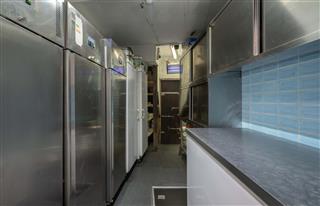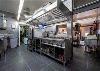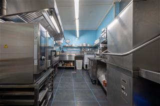 De keuken is bereikbaar via het midden gedeelte en via de achterzijde voor de levering van goederen. In de goed uitgeruste keuken vind je in het voorste deel een grote grill, friteuse, gyros grill en een koelwerkbank. In het achterste deel staat onder andere een 6-pits gasstel, friteuse, Rational oven (splinternieuw) en diverse koelwerkbanken. Er is een afwaskeuken met een professionele vaatwasmachine. Verder zijn er voldoende vriezers, koelingen en opbergkasten. In 2020 is de keuken voorzien van rubberen, veiligheid antislip tegels en design wandtegels in de kleur van de Middellandse Zee.