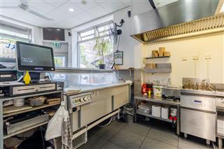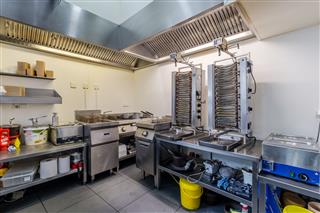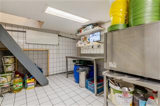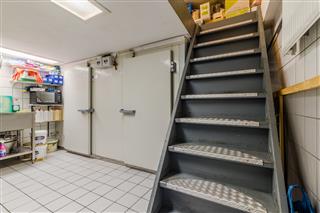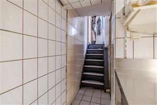 De deels zichtbare keuken is compact (ca. 15m²) en efficiënt ingericht, gericht op snelle bereiding van pita’s en schotels. Met een trap naar beneden is er nog een tweede ruimte waar zich zowel een koel- als vriescel bevinden. En een voorbereidingskeuken. Daarna weer de trap op naar een ruime opslag waar ook het personeelstoilet zich bevindt.