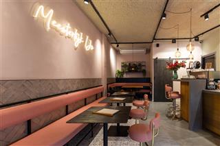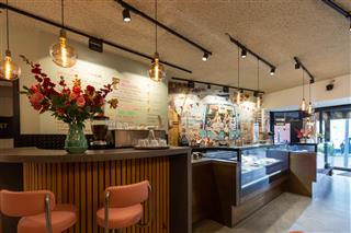 De verkoopruimte is ca. 60 m² en is sfeervol ingericht met diverse zitmogelijkheden, waaronder twee hoge houten tafels met vintage krukken, een lange bank met stalen onderstel, mooie tafels met vintage krukjes en een cosy corner met bank en stoelen. Alle meubels zijn vervaardigd uit hoog-waardige materialen, wat bijdraagt aan een stijlvolle en duurzame uitstraling en plaatst biedt aan circa 23 gasten.
