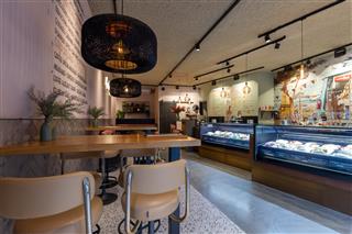 De ijssalon beschikt over een schuifwand aan de voorzijde, waardoor de winkel volledig geopend kan worden en een open, uitnodigende sfeer creëert. Bij binnenkomst wordt men direct verwelkomd in de verkoopruimte, waar de hoogwaardige ijsvitrine aan de rechterzijde onmiddellijk de aandacht trekt. Deze prachtige ijsvitrine zorgt voor een optimale presentatie van het assortiment. Een vitrine vol verleidelijke kleuren en smaken, uitnodigend voor elke bezoeker. Aan het einde van de vitrine bevindt zich de espressobar met zitplaatsen waar gasten kunnen genieten van verse koffie.
