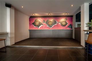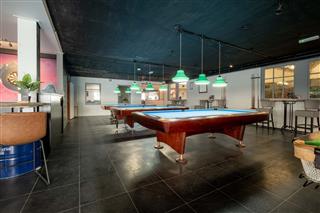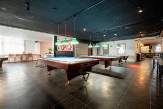 Wie de trap naar de eerste verdieping neemt en rechtdoor loopt komt in een grote ruimte van maar liefst 800 m2. Hier vind je 4 bowlingbanen, 5 pooltafels, 2 snookertafels, 1 biljart en 3 dartborden. Tal van sporten dus op één plek. De bowlingbanen zijn zodanig in trek dat reserveren nodig is. Wat betreft de keusporten, kun je binnenlopen en kijken welke tafel vrij is. Darten kan gratis op elk bord dat vrij is. In deze ruimte vind je daarnaast een aantrekkelijke bar van waaruit iedereen bediend wordt. Daar staat onder andere een goede koffiemachine, muziekinstallatie en vitrinekoelkasten. Je vindt hier een frituurhoek voor de snacks die gasten bij hun drankje kunnen bestellen.