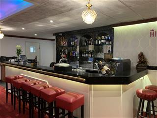 Aan de achterzijde is de ruime bar gesitueerd. De toiletten en de keuken bevinden zich eveneens aan de achterzijde van het gebouw.