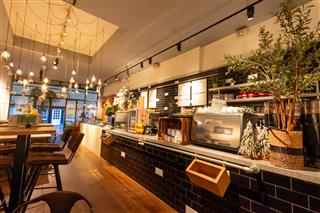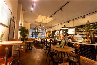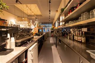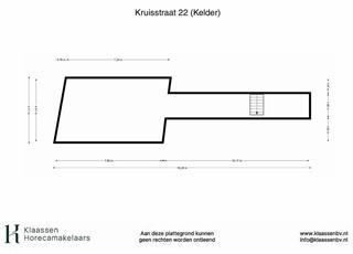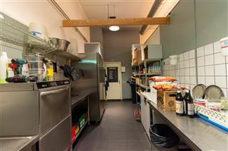 Links achterin leidt een deuropening naar de achtergelegen bereidingskeuken, voorzien van voldoende opslagruimte en extra horeca-inventaris. Via deze ruimte is ook het souterrain van circa 50 m² bereikbaar, wat momenteel niet gebruikt wordt, maar met beperkte aanpassingen wel geschikt kan worden gemaakt als extra opslag- of werkruimte.