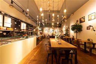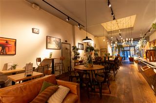 Bij binnenkomst bevindt zich aan de voorzijde het lichte en open zitgedeelte, waar grote raampartijen zorgen voor veel daglicht en uitstekend zicht op de dynamiek van de Haarlemse binnenstad.