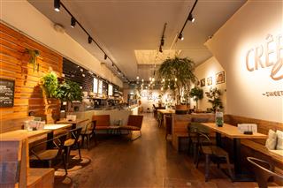 Aan de linkerzijde ligt de ruime open keuken en bar. Hier staat beleving centraal: gasten zien hoe het crêpe beslag wordt verdeeld over de hete bakplaat, hoe verse ingrediënten worden bereid en hoe de verse koffie wordt gezet. De rechterzijde van de zaak is ingericht met diverse zitplaatsen: hoge tafels, een lange stamtafel en meerdere ronde tafels. Deze variatie zorgt voor een toegankelijke en huiselijke uitstraling.