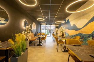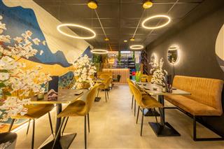 Het restaurant is stijlvol en sfeervol ingericht. De indrukwekkende muurschildering, geïnspireerd op Japan als het land van de rijzende zon, trekt direct de aandacht. De warme, elegante kleuren – zwart, goud, oker en zeegroen – geven het geheel een luxe uitstraling. Gasten kunnen plaatsnemen aan één van de 8 vierkante of 7 ronde tafels. Met 21 stoelen, 2 zitbanken en een loungebank is er ruimte voor ruim 20 gasten. Aan de achterzijde van het restaurant bevindt zich een fraaie bar met houten lambrisering en leuke neonletters. Sowieso valt de fraaie verlichting in combinatie met spiegels op; die maakt de ruimte extra sfeervol. De bar dient als uitgiftepunt voor dranken en gerechten die telefonisch of online besteld zijn. Even wachten kan in een kleine zithoek. De bar is volledig uitgerust, met onder andere driedeurs koelkasten, een koffieautomaat en al het benodigde glaswerk. Rechts van de bar bevinden zich de toiletten.