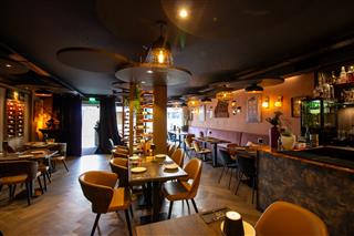 comfortabel aan. Gasten ervaren hier rust en ruimte om te genieten van de keuken en een zorgvuldig geselecteerd glas wijn, gepresenteerd in de beeldbepalende wijnrekken die het interieur extra allure geven. De op dit moment half open keuken zou gemakkelijk helemaal open kunnen worden gemaakt voor nog meer beleving.