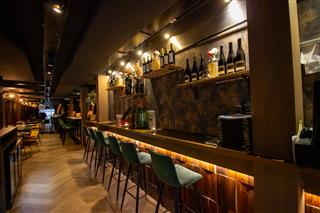 Aan de linkerzijde van de centrale ruimte bevindt zich de bar, die fungeert als verbindend element binnen het restaurant. Via de bar komt men in het tweede gedeelte van de zaak, een intiemer ingerichte ruimte met hoge tafels langs de wand en kleinere tafels voor vier personen. Dit gedeelte leent zich uitstekend voor zowel kleinere gezelschappen als informeel dineren. Verderop bevinden zich de toiletten, diverse opslagruimten en de toegangen tot de keuken, praktisch en logisch gepositioneerd voor een