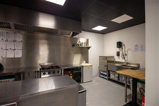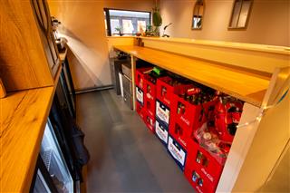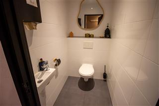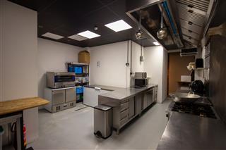 De afgesloten keuken is praktisch ingericht en biedt volop werk- en opslagruimte, zonder afbreuk te doen aan de beleving in het gastengedeelte. Voor de gedeeltelijke afsluiting van de keuken ten opzichte van het zitgedeelte is een beweegbare muur neergezet. Deze zou eventueel eenvoudig kunnen worden verwijderd voor het realiseren van een andere indeling. Centraal in het object zijn de gescheiden toiletten gesitueerd.